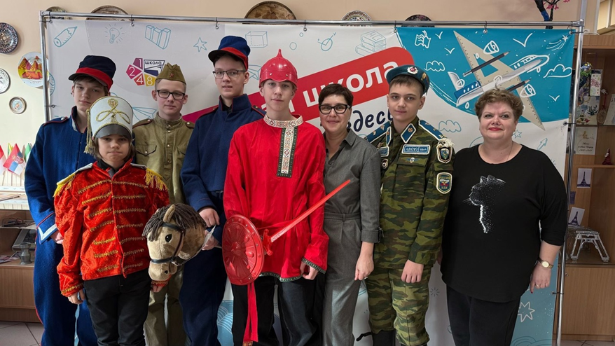В первом здании учащиеся 7-х классов (классные руководители Королева Ю. М., Алемайкина Я. Л., Гапонова М. В.) провели яркое и необычное мероприятие. Праздничная атмосфера создавалась уже на подходе к школе, где всех приветствовали стихами и музыкой. При входе в школу учащихся и учителей встречали костюмированные персонажи, представляющие историю защитников земли русской — от былинных богатырей до Юнармейцев. Они вручали всем мальчикам и мужчинам поздравительные открытки. На первом этаже была создана фотозона, где все желающие могли сфотографироваться с богатырём, гусаром, казаками, красноармейцем, солдатом Великой Отечественной войны и современным десантником. Для учащихся начальной школы подготовили выступление под названием «От русских богатырей до защитников наших дней». Ребята узнали много интересных фактов о защитниках Отечества и активно отвечали на вопросы ведущих. Весь день в школе царила праздничная атмосфера, наполняя школьный дом радостью и гордостью за защитников Отечества. Хочется выразить благодарность всем ребятам и нашим верным помощникам — родителям, принявшим участие в подготовке праздника.